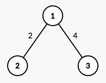 [2,4]: The shortest path from root node 1 to node 4 consists of edges (1,2), (2,3), and (3,4) with weights 2 + 1 + 5 = 8.[2,3]: The shortest path from root node 1 to node 3 consists of edges (1,2) and (2,3) with weights 2 + 1 = 3.[1,2,3,3]: The weight of edge (2,3) changes from 1 to 3.[2,2]: The shortest path from root node 1 to node 2 is 2.[2,3]: The shortest path from root node 1 to node 3 consists of edges (1,2) and (2,3) with updated weights 2 + 3 = 5.Constraints: