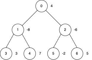 Input: edges = [[0,1],[0,2],[1,3],[1,4],[2,5],[2,6]], nums = [4,-8,-6,3,7,-2,5], k = 2